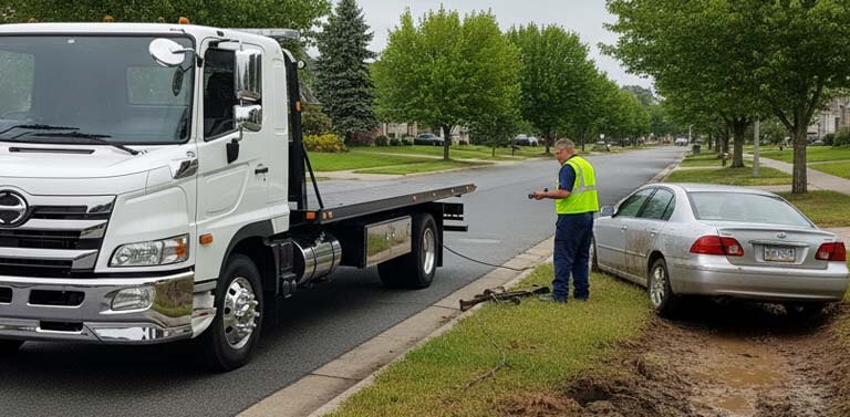When you call us, our dispatcher will ask a few quick questions about your location and vehicle condition. Then we’ll send a nearby recovery truck equipped with winching tools.